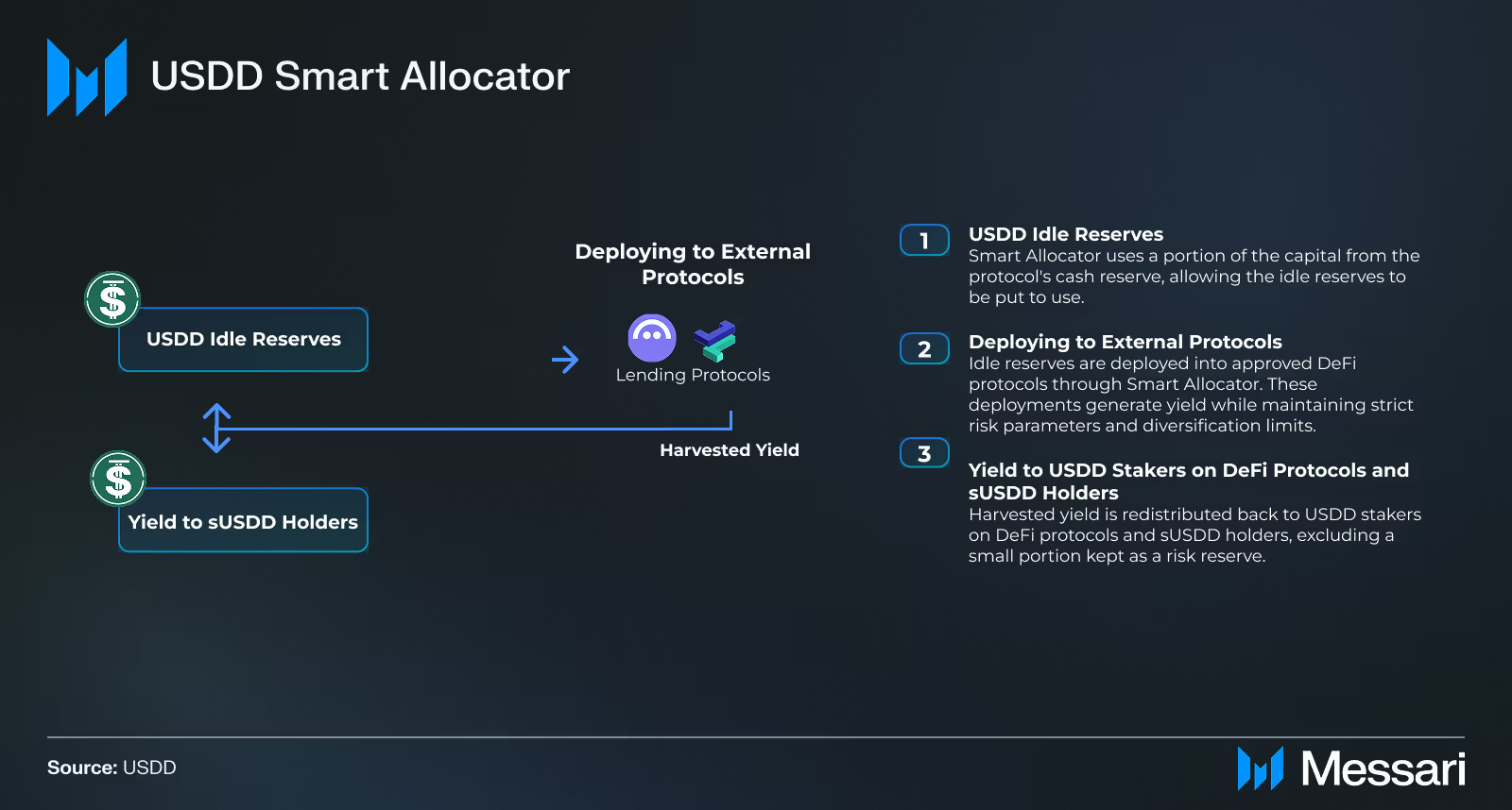Smart Allocator 带来源源不断的收益造血:将 USDD 的闲置现金储备资金自动部署到 Aave、Morpho、JustLend、Spark 等高流动性、高可靠性 DeFi 协议,以赚取利息、平台奖励和资金费率,收益将全部返还给 USDD 和sUSDD 持有者;
