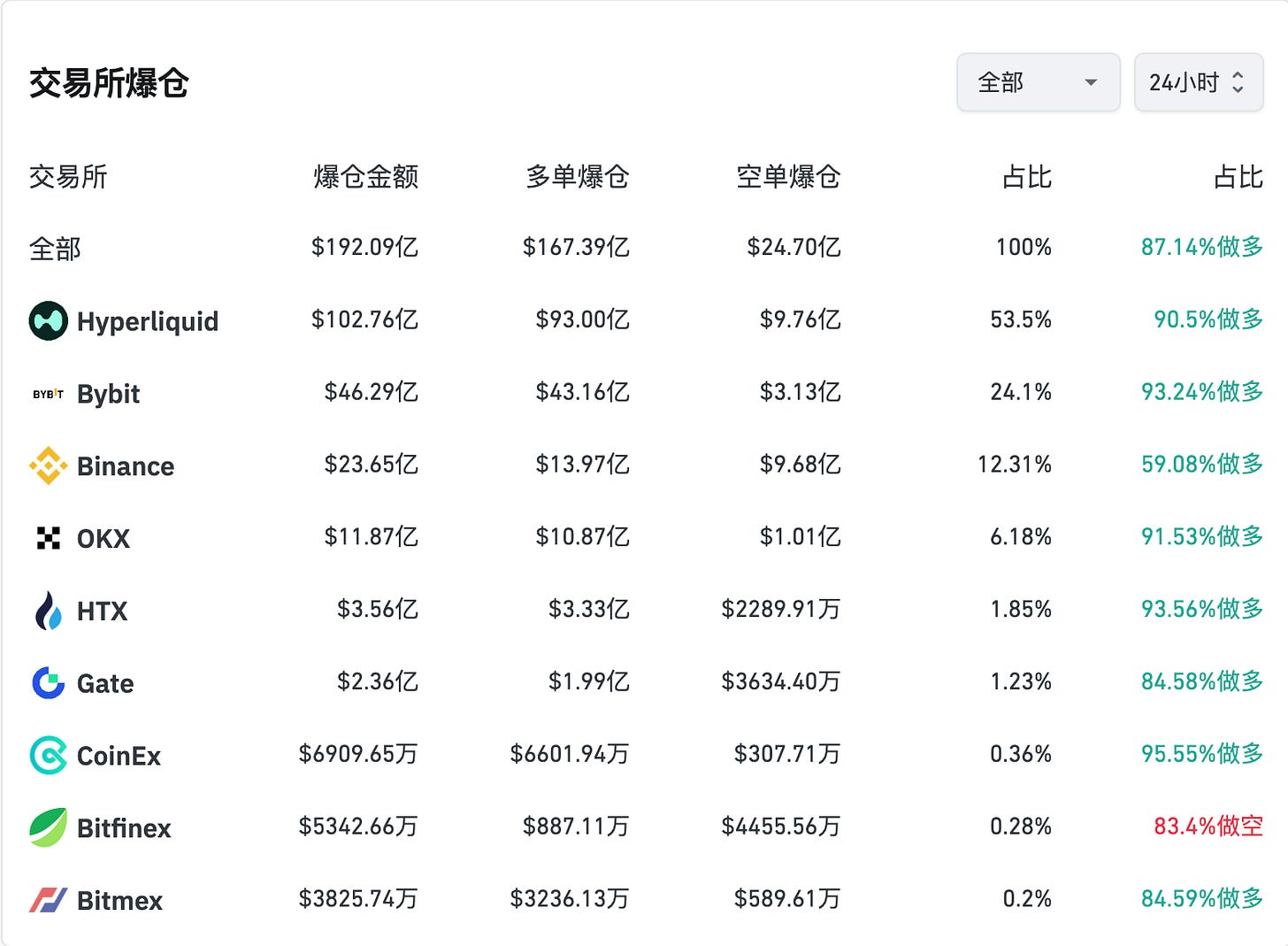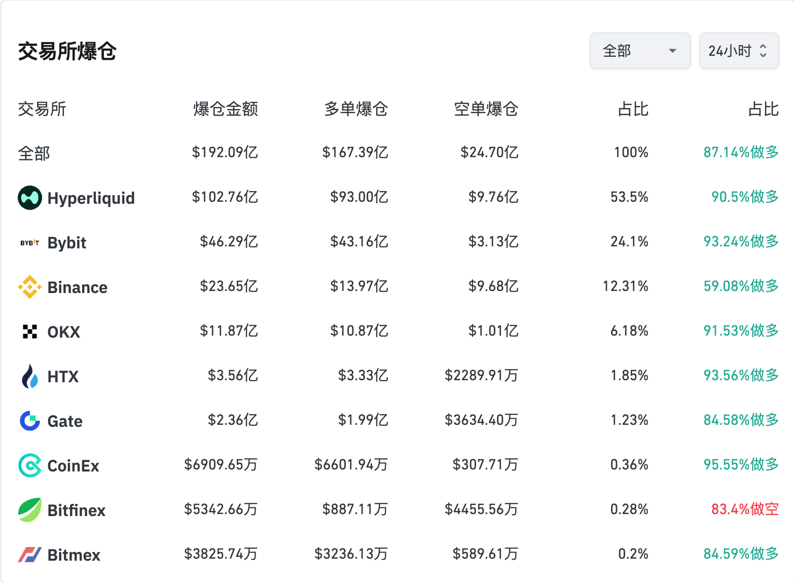然而,这数据或许只是冰山一角,据相关从业者透露,真实爆仓数据远超公开,“Binance 爆仓数据应该远超 Hyperliquid 和 Bybit”,根据 Coinglass 数据披露,目前 Binnace 爆仓数据仅为 Hyperliquid 的 5 分之一。
