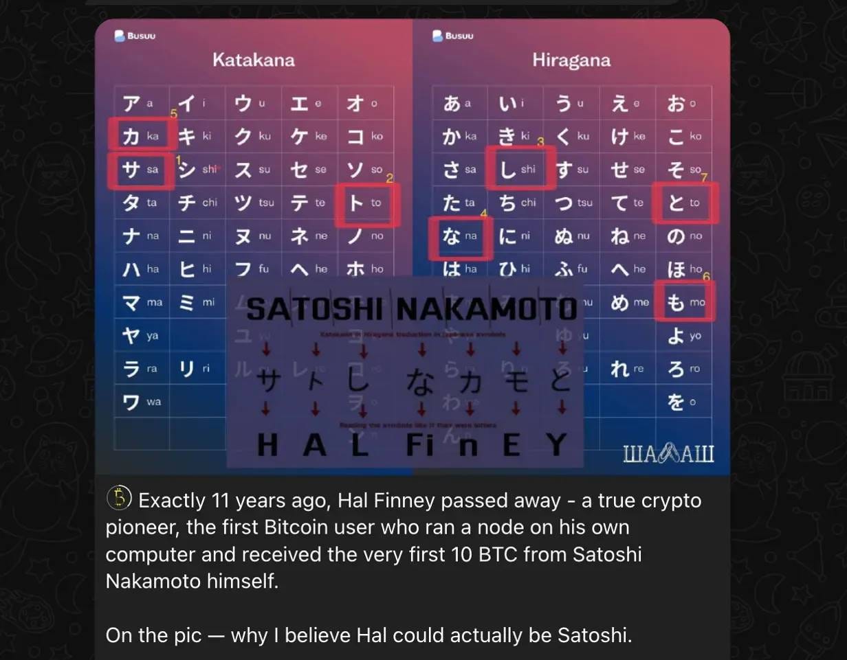 有人在社媒上发布了一张日文假名表的图片,以中本聪的姓名为引子,借助东西方字符在形态上的微妙巧合,认为这些假名在形状和排列上指向了 Hal Finney 的英文名。