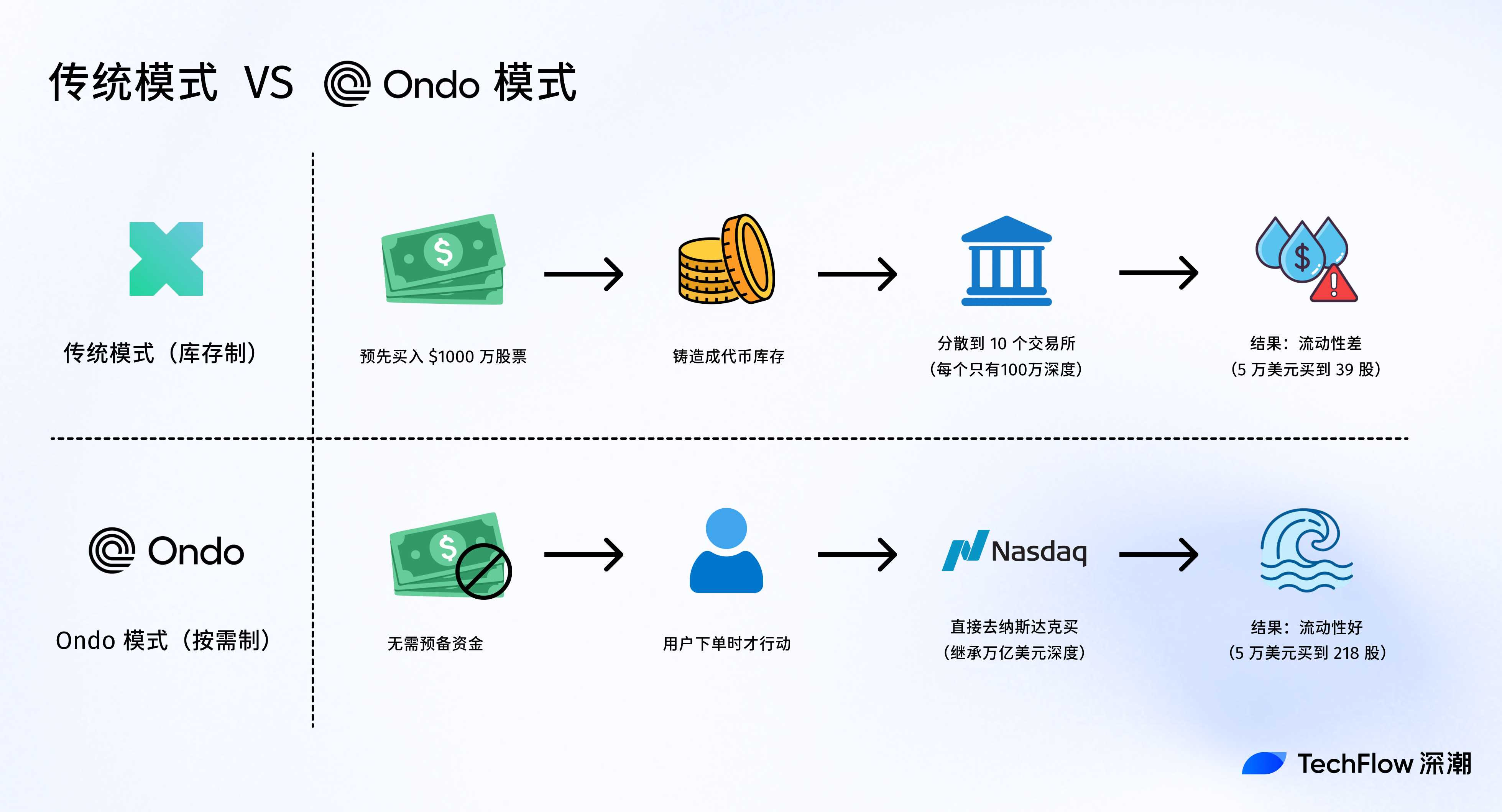 Ondo 并不像传统模式那样提前囤货、自己建流动性,而是当有用户下单时,平台才会去买入真实股票并在链上铸造 Token 版本。