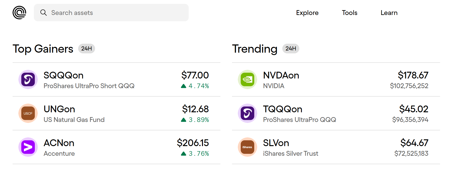 265 个代币化标的覆盖包括美国上市公司、中概股、能源与大宗商品相关资产、债券、指数 ETF,以及杠杆与反向 ETF 等多个资产类别。