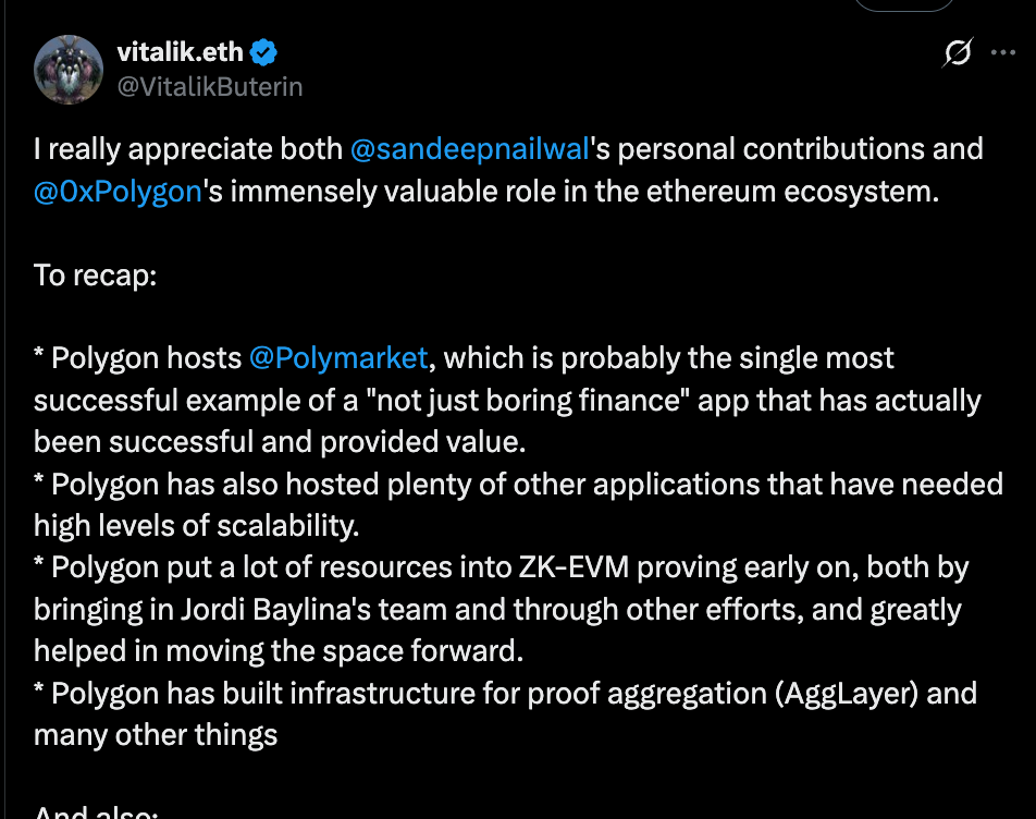 详细列举了 Polygon 的贡献(托管 Polymarket、推进 ZK 技术等)