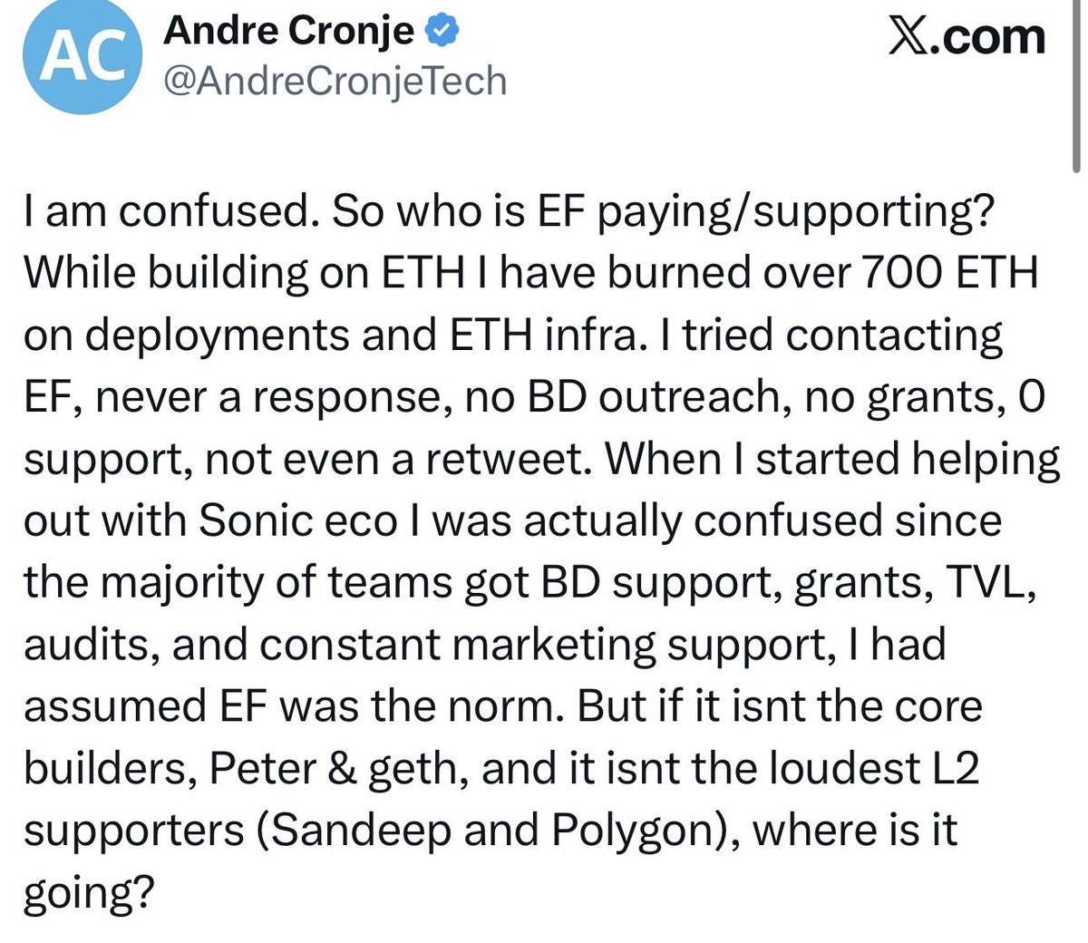 “我很困惑。EF 到底在付钱给谁/支持谁?我在 ETH 上构建时,光是部署合约和基础设施就烧掉了 700 多个 ETH。我试图联系 EF,从来没有回应,没有 BD 接触我,没有资助,零支持,连个转发都没有。”