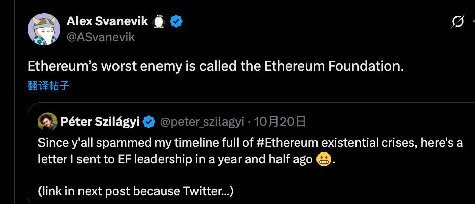 翻看 Péter 之前的推文,确实有些针砭时弊和直言不讳的味道,经常就以太坊生态内的一些问题发表讨论;而这封长信所透露出的内容,则意味着这些言论更像是一场为了迎合以太坊基金会集体利益的表演。
