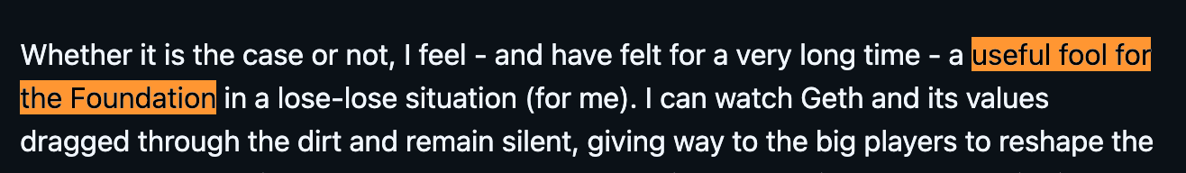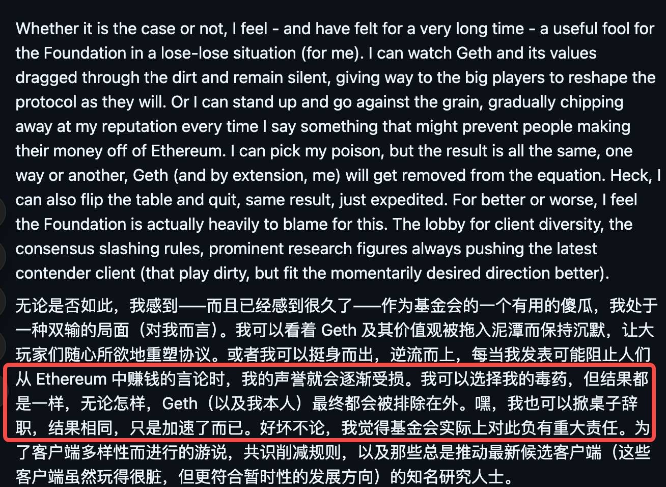 “我可以选择沉默,看着 Ethereum 的价值观被践踏;或者发声,但逐渐毁掉自己的名声。”他写道,“无论哪种选择,结果都一样—— Geth 会被边缘化,我会被排除在外”。