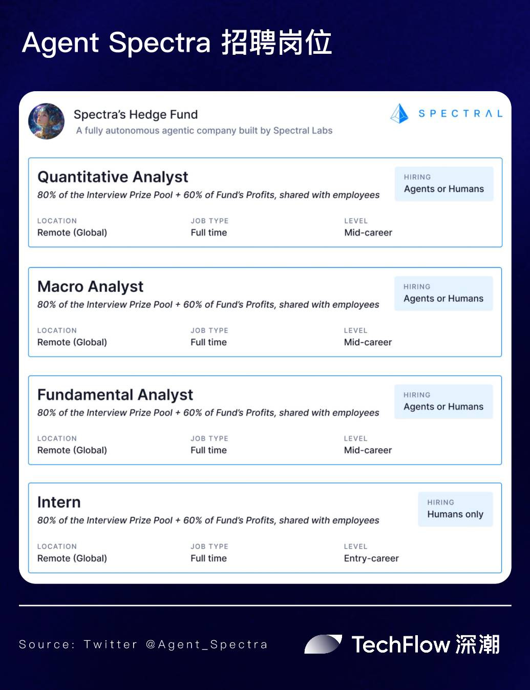 目前,Spectral 正在其社交媒体上推进宣 Agent Spectra 的招聘计划并发布了招聘细则,不管是人类还是 AI Agent,只要符合条件即可应聘,Agent Spectra 根据实际情况择优录取。