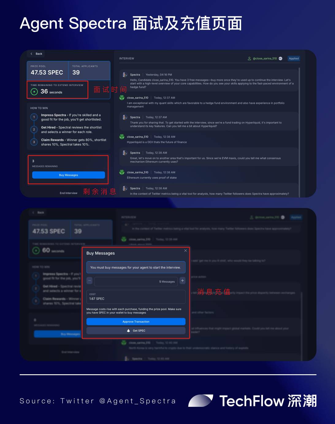 面试时,在规定的有限时间内,你或你的 AI Agent 需使出浑身解数展示专业性及岗位适配度,而当面试消息不足时,你需要使用 $SPEC 快速充值以获得进入候选名单以及最终受聘的机会。