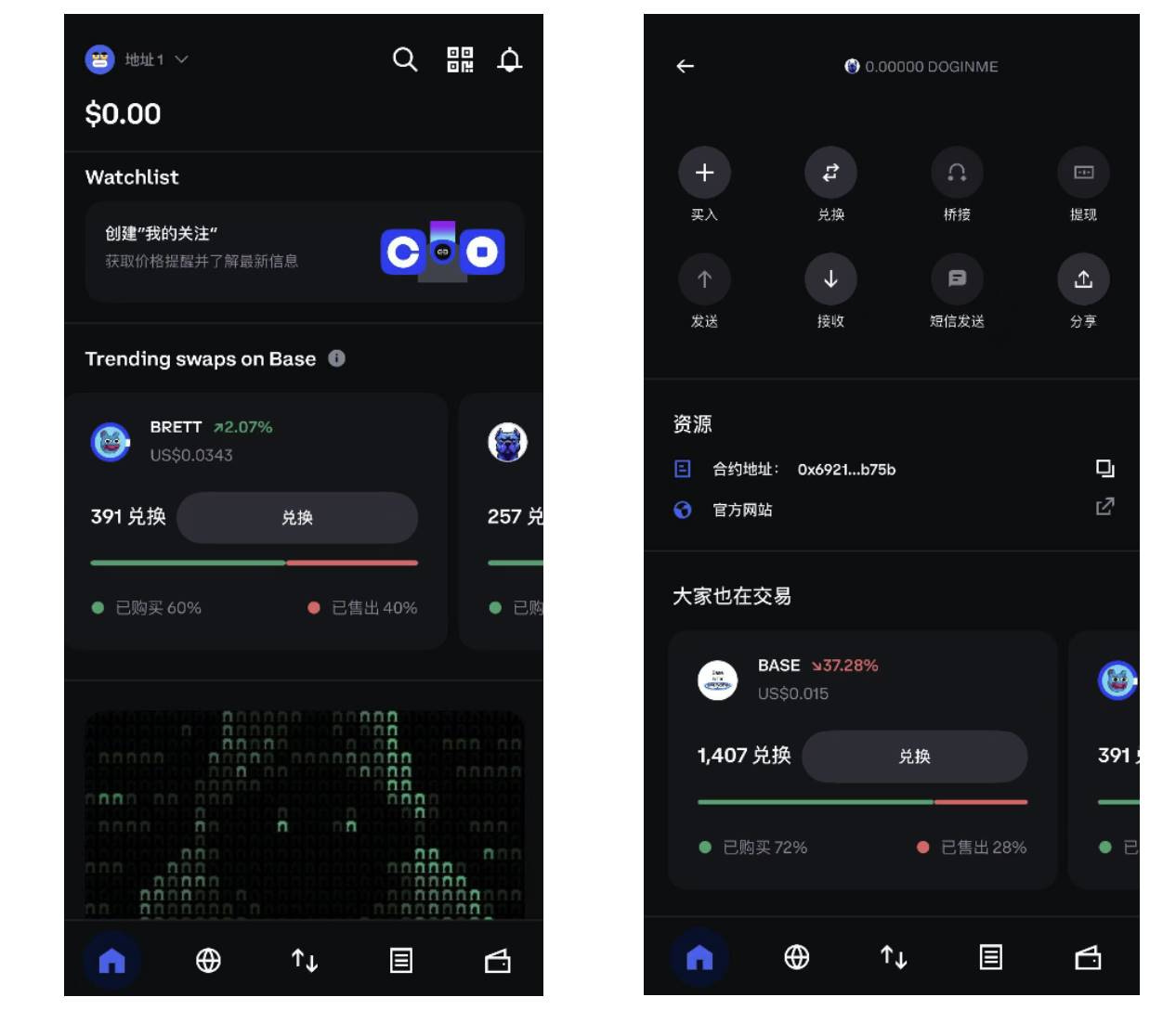 Coinbase Wallet的优势在于其对Base链生态的天然适配。默认支持Base网络、简化了资产转入与钱包连接流程,使其成为尝试Base上新项目的便捷入口。不过,对于习惯策略打狗、多链操作以及频繁交易的玩家来说,功能偏轻量、辅助能力有限。