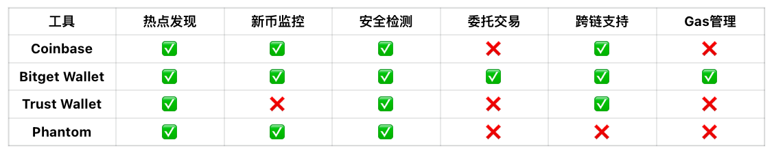 基于前文对4款主流钱包在MEME交易场景下的功能拆解,我们整理出以下对比表,帮助玩家简要、快速了解各工具在“打金狗”流程中的功能覆盖与使用便捷度。虽然在打狗赛道前有GMGN后有AXIOM,但是对于想要在多链之间高效穿梭、迅速完成出手与离场,在移动端靠一个工具全都搞定的用户来说,Bitget Wallet这类全能型的钱包工具或是更值得优先上手的选项。