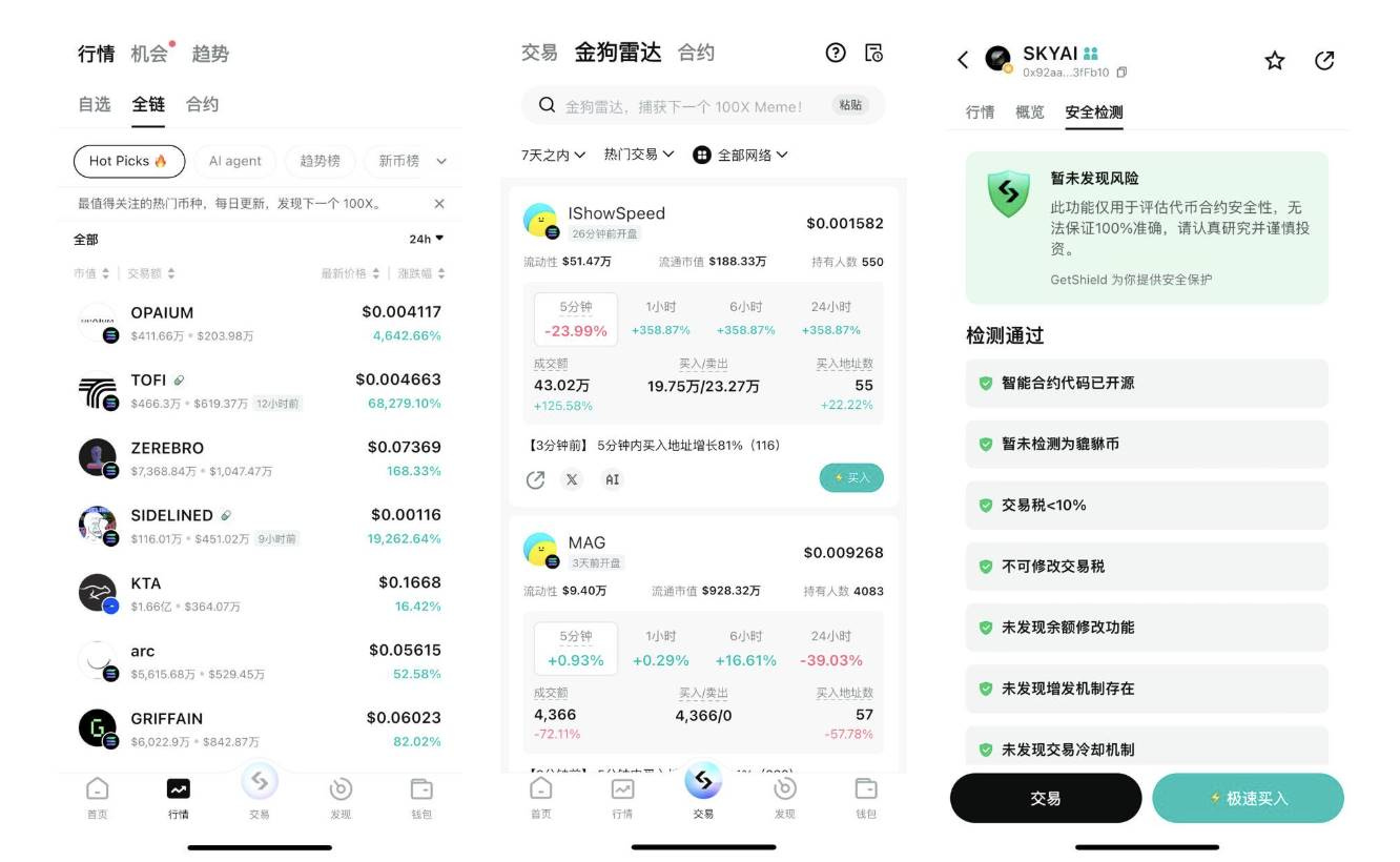 目前,三方工具如GoPlus、MEME聚合平台GMGN可辅助检测以上风险,适合自行筛选。也可以选择以Bitget Wallet为代表的一站式工具,已对MEME币完成全面筛选,根据不同链的特性,确保项目方无法在合约上进行作恶,代币具有高安全标准。