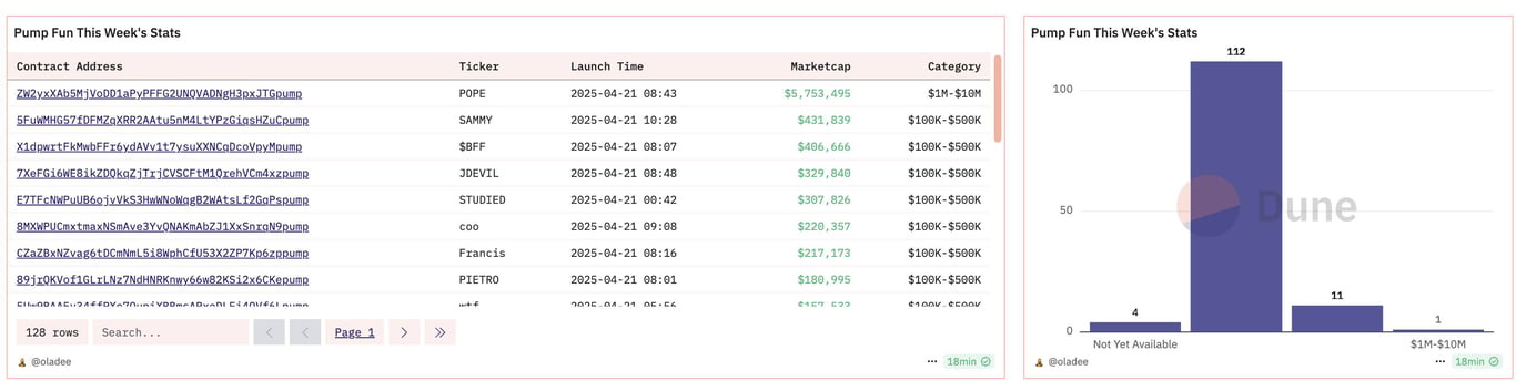 即便市场情绪偏弱,链上依然有结构性机会。4月初关税事件引发短暂波动,但资金与活跃度并未明显下滑,根据Dune数据,截至4月21日晚间,Pump.fun当天就跑出一个市值突破500万美元的项目,另有11个市值在10万~50万美元区间的中型项目接连冒出--显示资金仍在积极寻找早期标的。