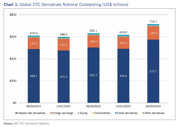 根据国际清算银行(Bank for International Settlements, BIS)2023年底发布的场外衍生品市场数据报告,截至2023年上半年,未偿还的利率衍生品名义总额为573.7 万亿美元,是全球金融衍生品中份额最大的市场,足见其普及程度。