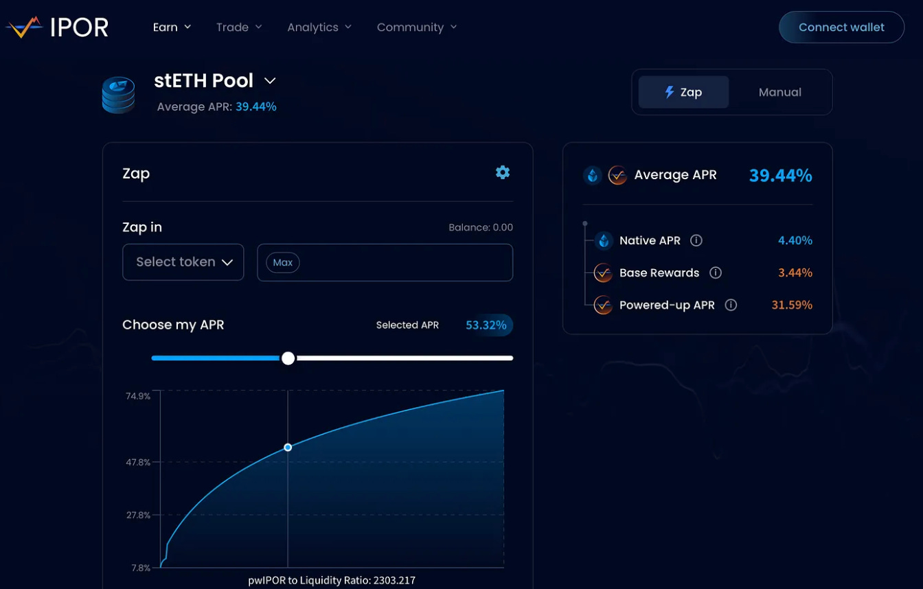 在具体产品上,如果你持有stETH,可以将其在IPOR上进行流动性提供,相应的池子允许用户选择自定义APR,并通过两次快速点击获取它的zap-in功能,快速完成提供流动性的操作享受收益。