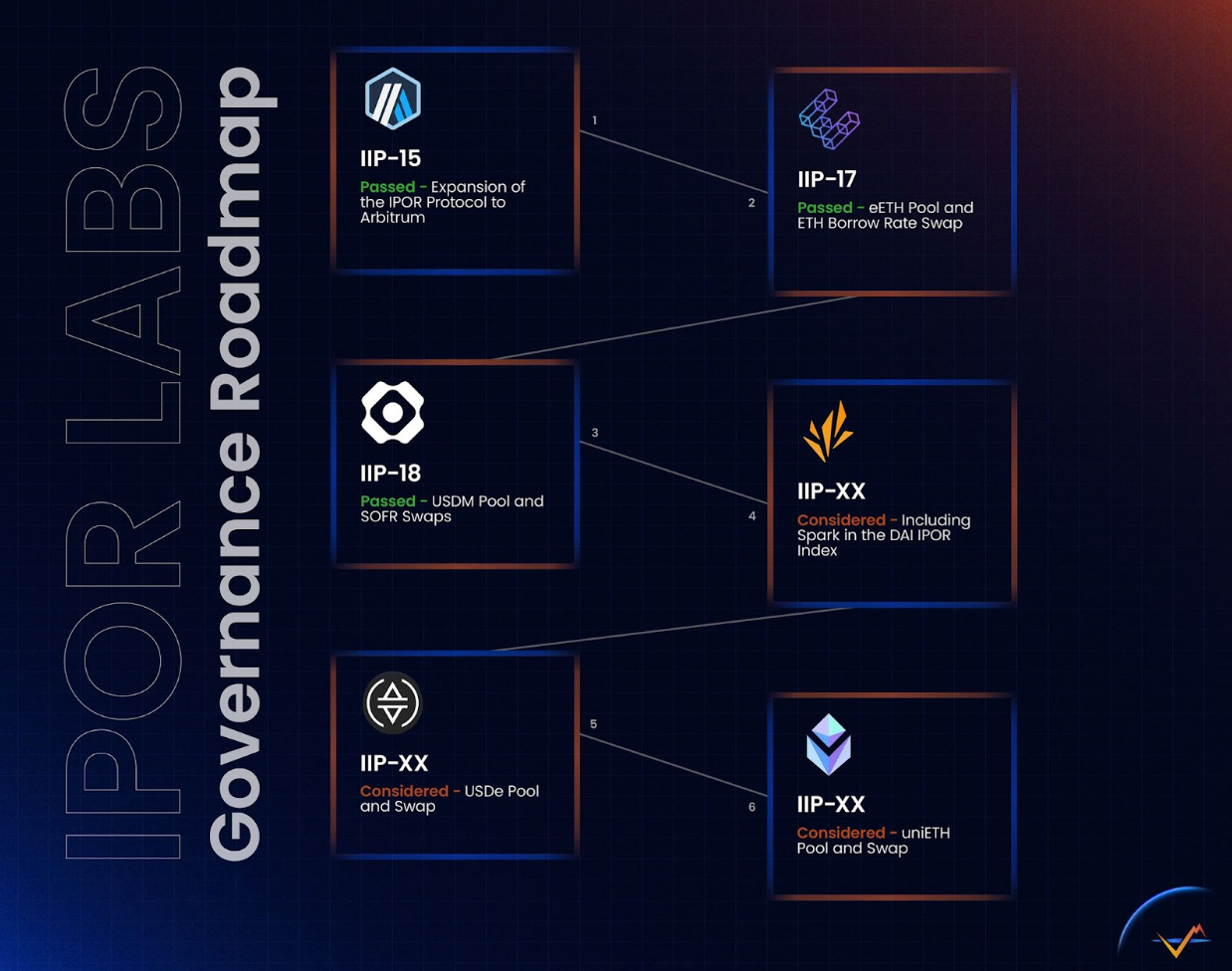 从IPOR官方的治理路线图和提案来看,今年3月其还将增加 eETH 和 USDM 的流动性池,丰富利率互换资产的种类;同时USDe 和 uniETH 也在项目的考虑中。