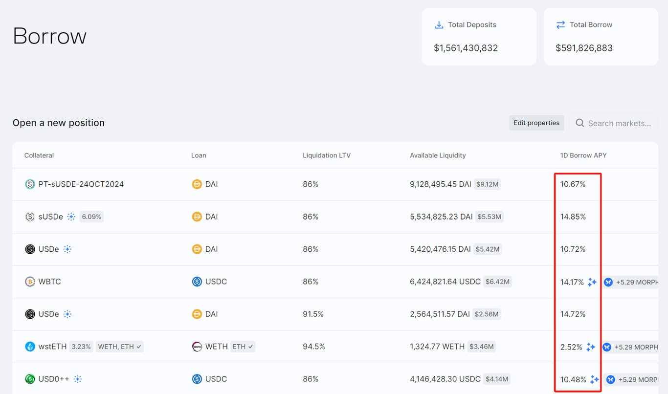 在 DeFi 领域,最举代表性的合作莫过于 MakerDAO(当然,现在称之为 Sky),今年三月,MakerDAO 旗下借贷协议 Spark 通过 Morpho 部署了 1 亿美元的新 DAI 流动性,资金被分配至 sUSDe/DAI 和 USDe/DAI 市场,用户可以通过 MakerDAO 支持的高效杠杆头寸借入 Ethena 的稳定币 USDe 和 sUSDe,并利用 Maker 的流动性来增加对 sUSDe 和 USDe 的敞口。据不少 KOL 分析,MakerDAO 此举旨在应对 Aave 推出其稳定币 GHO,巩固其在 DeFi 领域的竞争力。