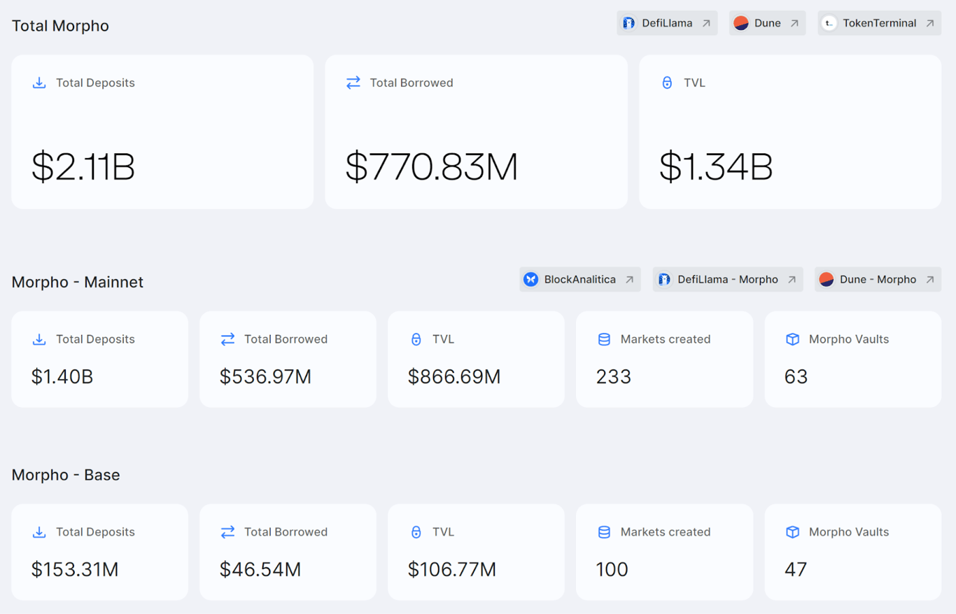 在部署的 Markets、Vaults 方面,目前在以太坊及 Base 网络上创建的 Morpho Markets 已超过 333 个,创建的 Morpho Vaults 达到了 110 个。