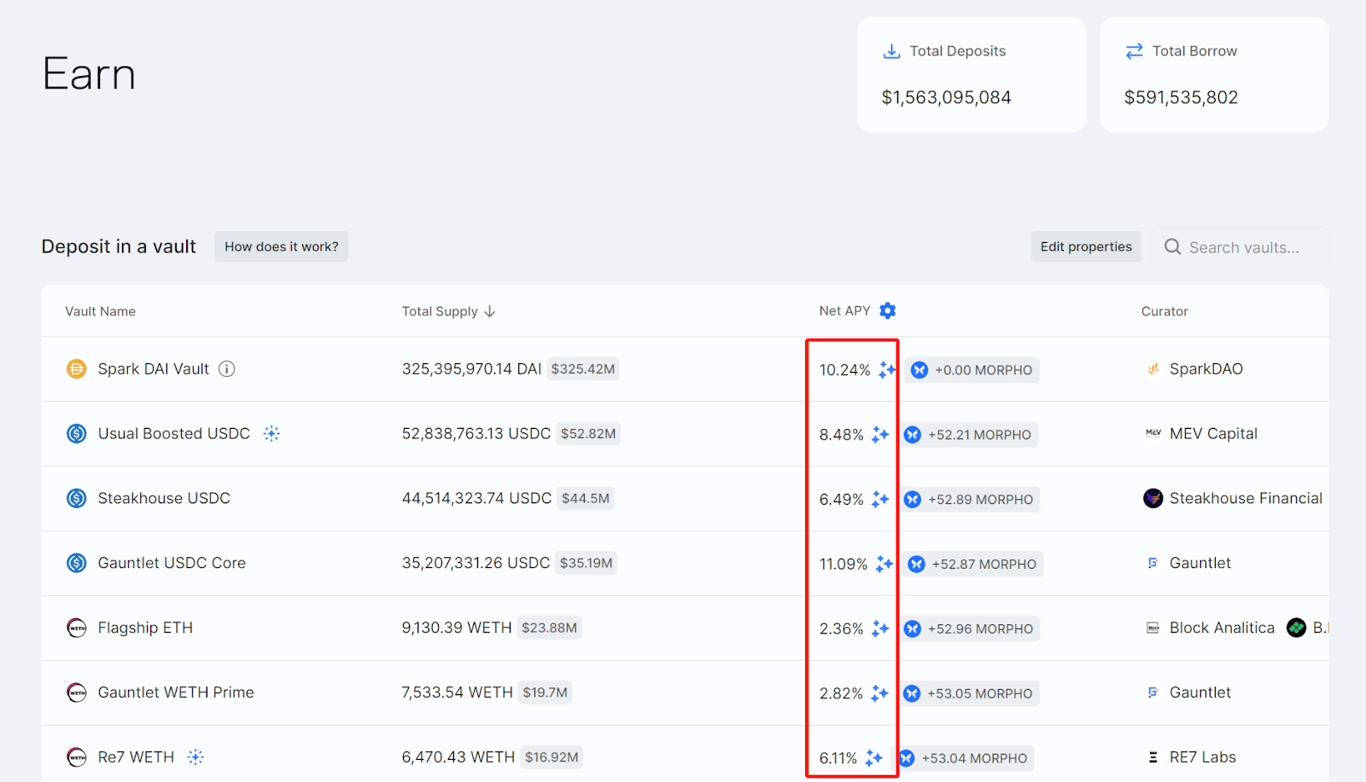 Earn 页面列出了各种 Morpho Vault,用户根据自身风险偏好选择金库并存入资产以获得收益。每个金库的收益不同并会随着市场波动,收益具体又三部分组成:原生收益(借款人支付的利息)、奖励 APY(第三方提供)以及 MORPHO 代币奖励。