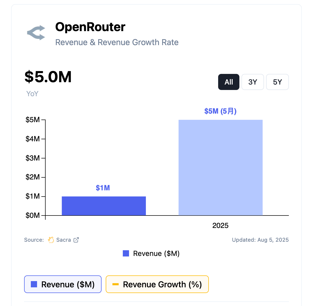 2024 年 10 月,每个月经过 OpenRouter 的钱是 80 万美元。到 2025 年 5 月,这个数字变成了 800 万美元。