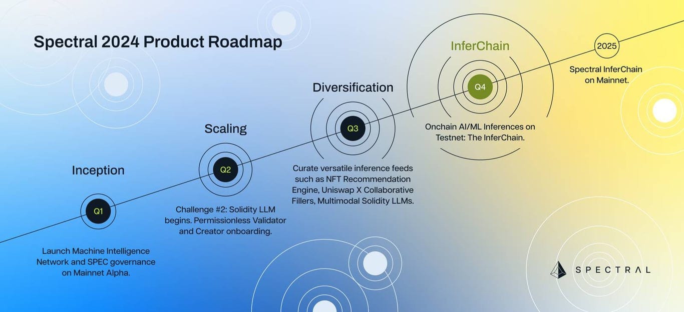 此外,2024 年 Spectral 的工作重点还将聚焦 Spectral Syntax、Spectral Nova 的功能迭代以及产品优化,包括代理交互代币化、企业 DevRel 代理以及积极寻求与优质项目的合作、开展系列市场推广活动鼓励社区积极参与与互动等。值得一提的是,Inferchain 预计将于2024 年底推出测试网,2025 年主网上线,届时项目将再次吸引广泛社区目光。