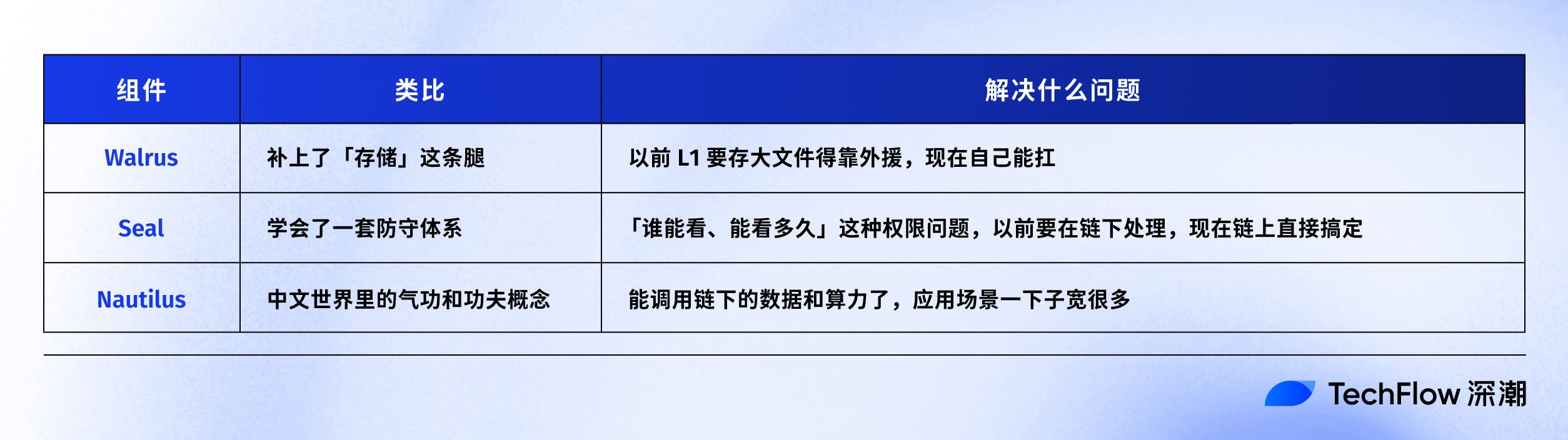 Walrus、Seal、Nautilus,再加上 Sui 主网本身,就是现在这套 Sui Stack 的基本盘。