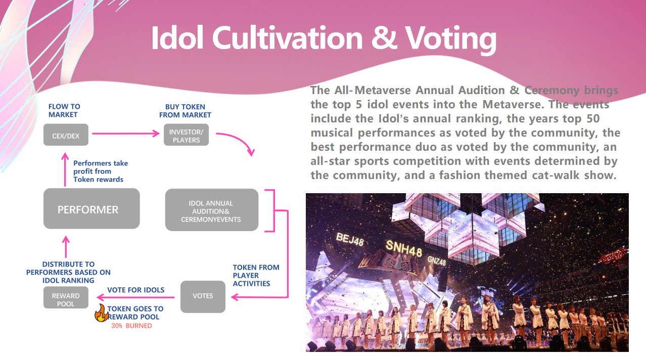 代币奖励不仅奖励给偶像,而且奖励池中的30%将被销毁,形成了一种有效的通缩机制,这有助于稳定代币的价值,并提高投资者和玩家的信心和参与度。