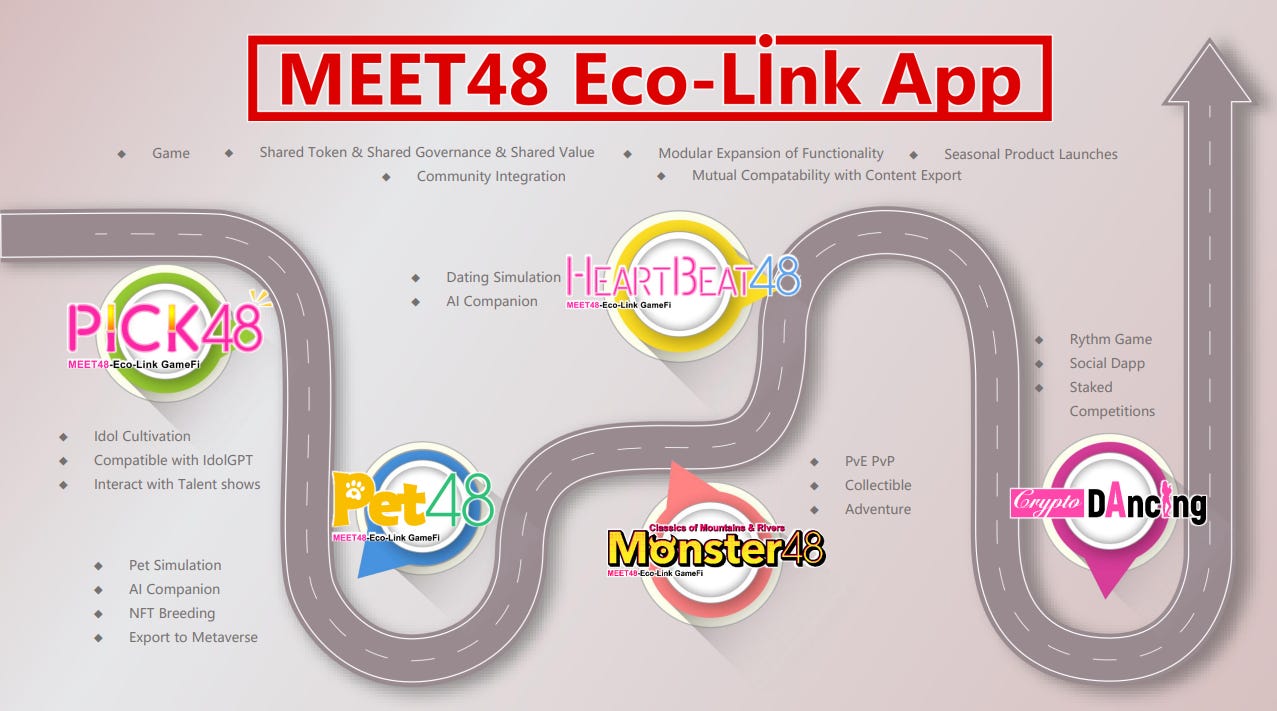 同时推出系列化的GameFi游戏产品:虚拟恋爱、舞蹈模拟、派对休闲、纸牌游戏、养宠、大富翁等,将持续强化MEET48的内容生态,带来不间断的用户增长。即将推出的全球领先的多维娱乐应用,将在强大的社区共识推动下,带来用户的增长,并有效地将他们转化为Web3.0用户。